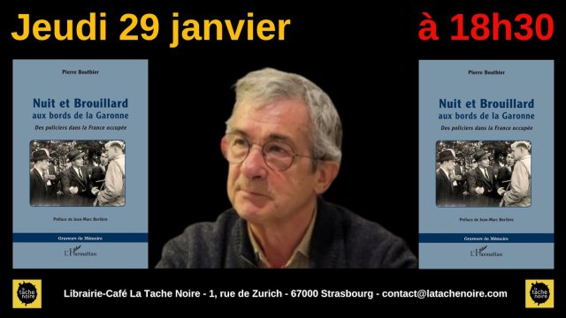 Réservez la date ! Jeudi 29 janvier à 18 h 30 à la librairie La Tache Noire à Strasbourg, on échangera avec Pierre Bouthier qui signera ensuite Nuit et Brouillard aux bords de la Garonne.